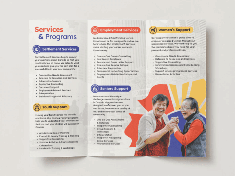 Developed a range of print and digital marketing collaterals to support newcomer and community programs, which included creating posters, flyers, and outreach materials.